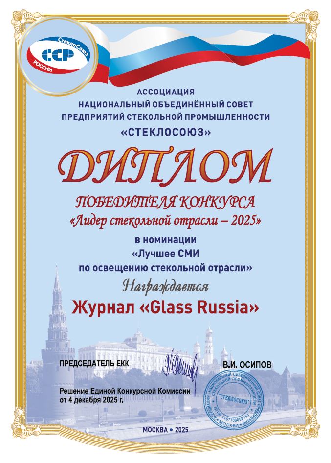 11 декабря 2025 года в рамках 26-го ежегодного отраслевого Форума «Стекло и современные технологии – XXI» состоялось награждение ПОБЕДИТЕЛЕЙ международного Конкурса «Лидер стекольной отрасли – 2025».