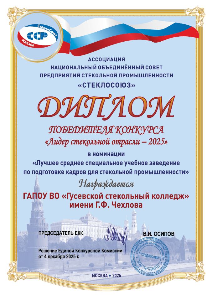 ⦿ Номинация: Лучшее среднее специальное учебное заведение по подготовке кадров для стекольной промышленности